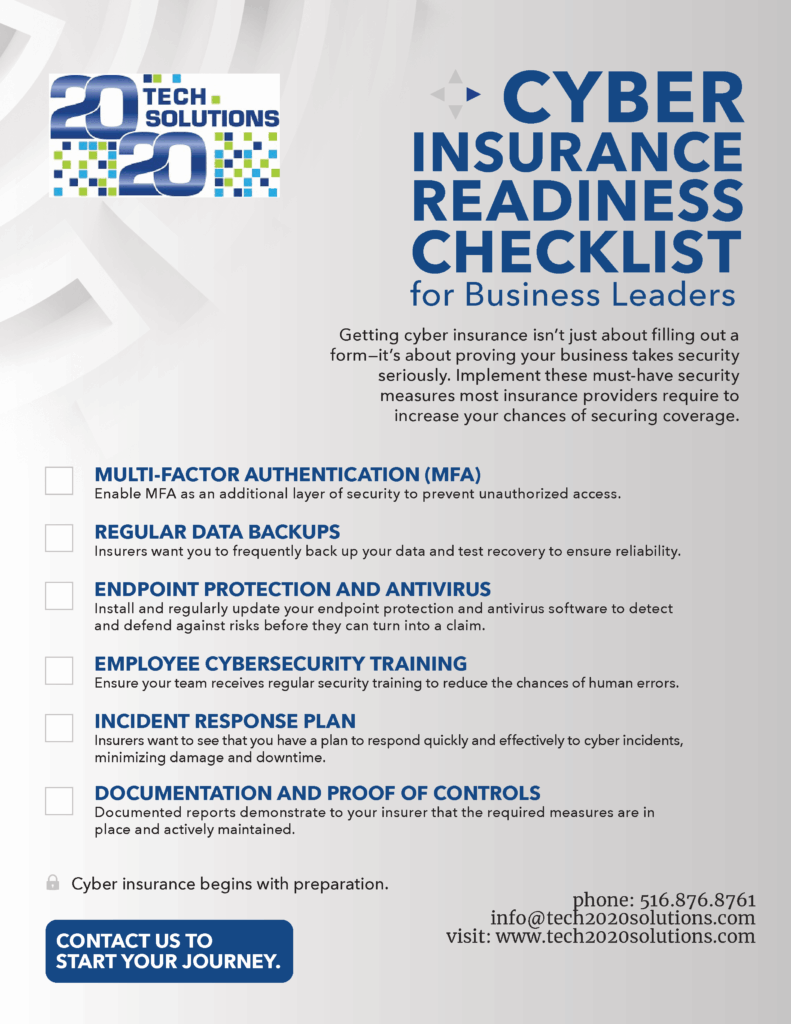 Getting cyber insurance isn’t just about filling out a form — it’s about proving your business takes security seriously. Insurance providers now require specific security measures, and missing even one can delay approval, raise your premiums, or leave you without coverage. Our Cyber Insurance Readiness Checklist walks you through the must-have controls most insurers look for — so you can be confident, compliant, and ready.